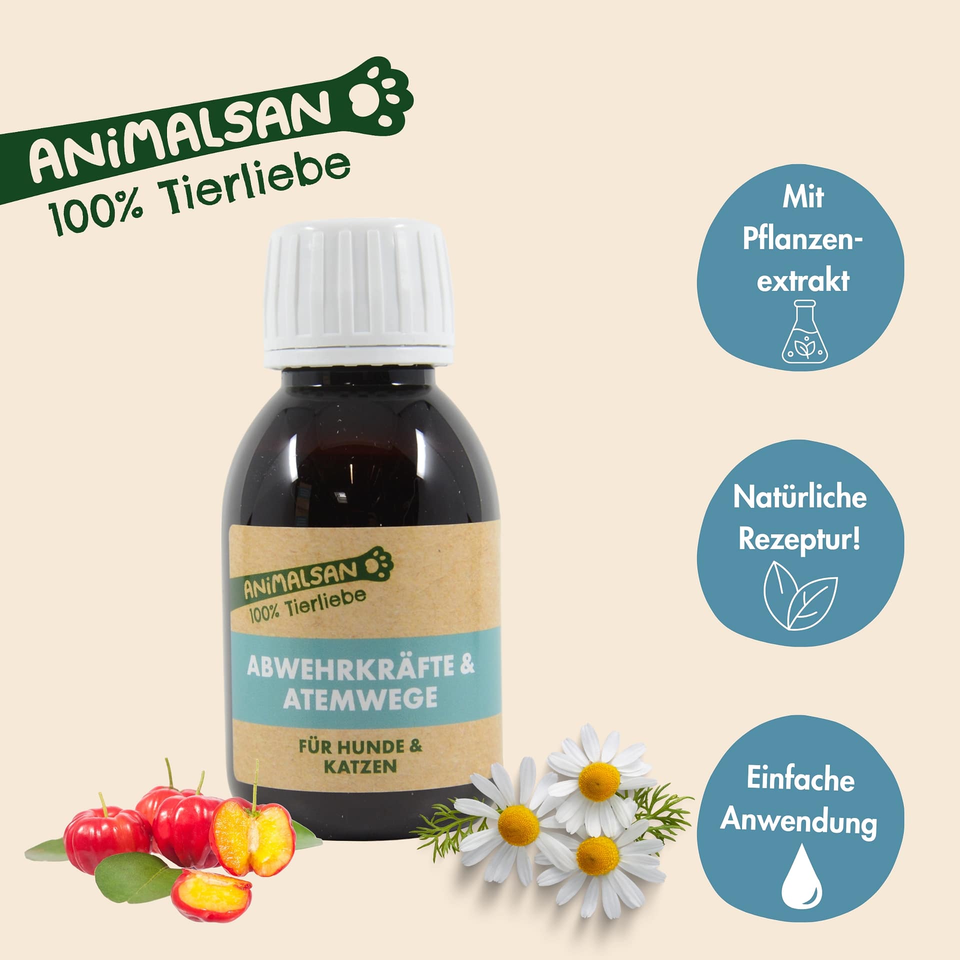 Ob beim Schnüffeln, Spielen oder Ausruhen, eine ausgewogene Atemwegsfunktion trägt zum allgemeinen Wohlbefinden deines Tieres bei. Animalsan Atemwege & Abwehrkräfte ist ein flüssiges Ergänzungsfuttermittel für Hunde und Katzen, abgestimmt auf die Fütterung in besonderen Lebensphasen, Zwingerhaltung, in der kalten Jahreszeit oder bei hoher Aktivität. Die ausgewählte Rezeptur mit pflanzlichen Extrakten ergänzt die tägliche Ernährung auf natürliche Weise: sanft, durchdacht und einfach in der Anwendung.
