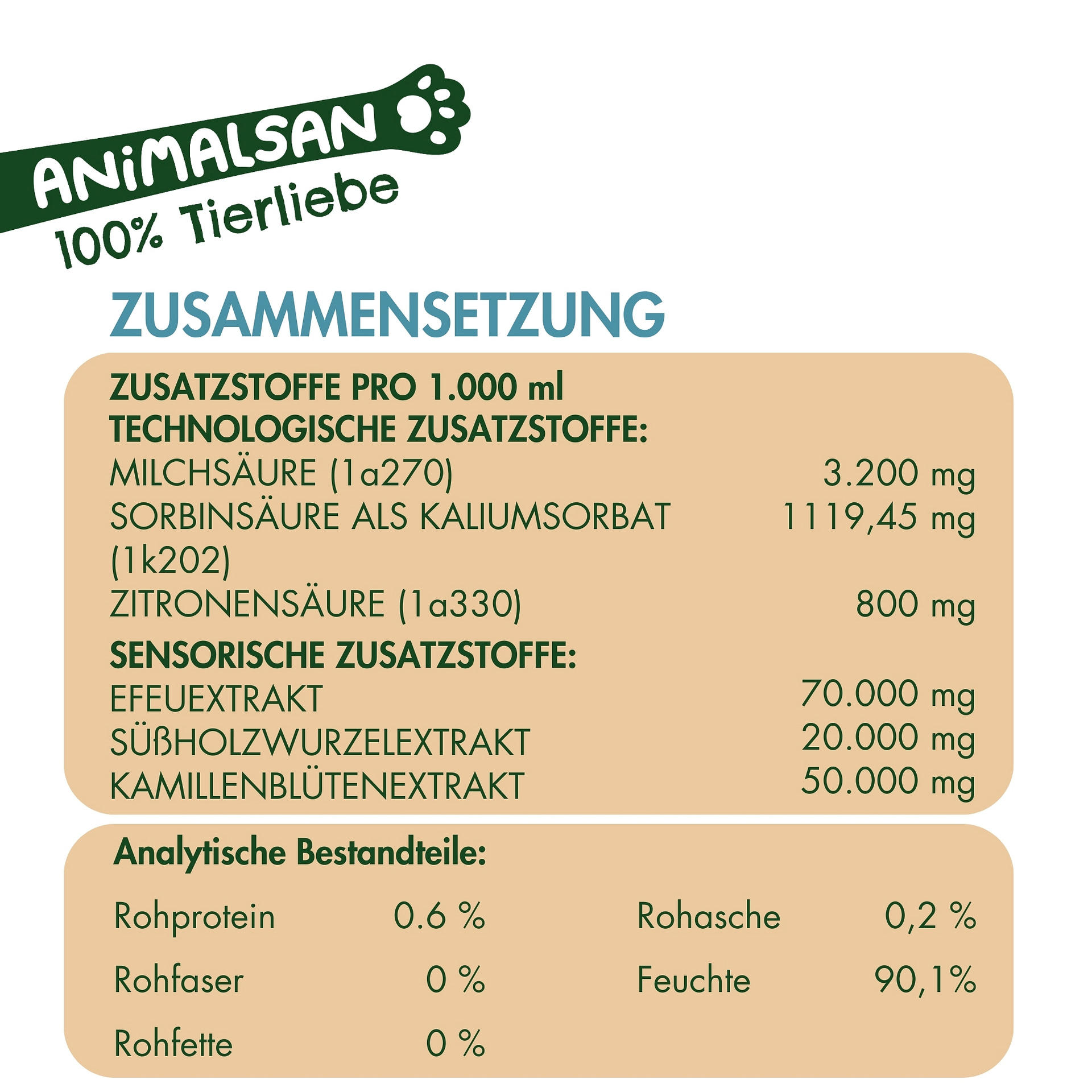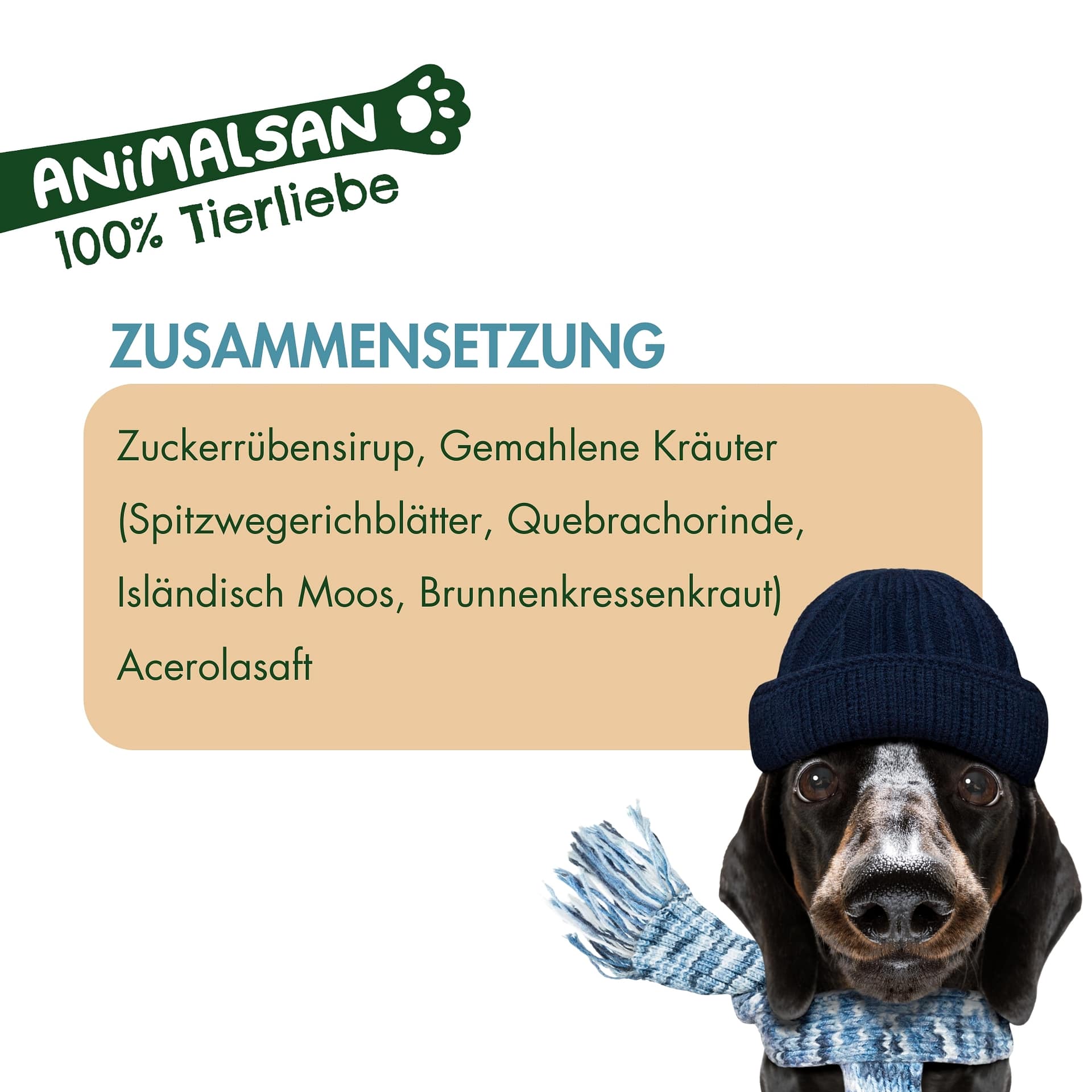 Animalsan Atemwege ist ein Ergänzungsfuttermittel. Es ersetzt keine tierärztliche Behandlung. Kühl, trocken und lichtgeschützt lagern. Außerhalb der Reichweite von Kindern aufbewahren.