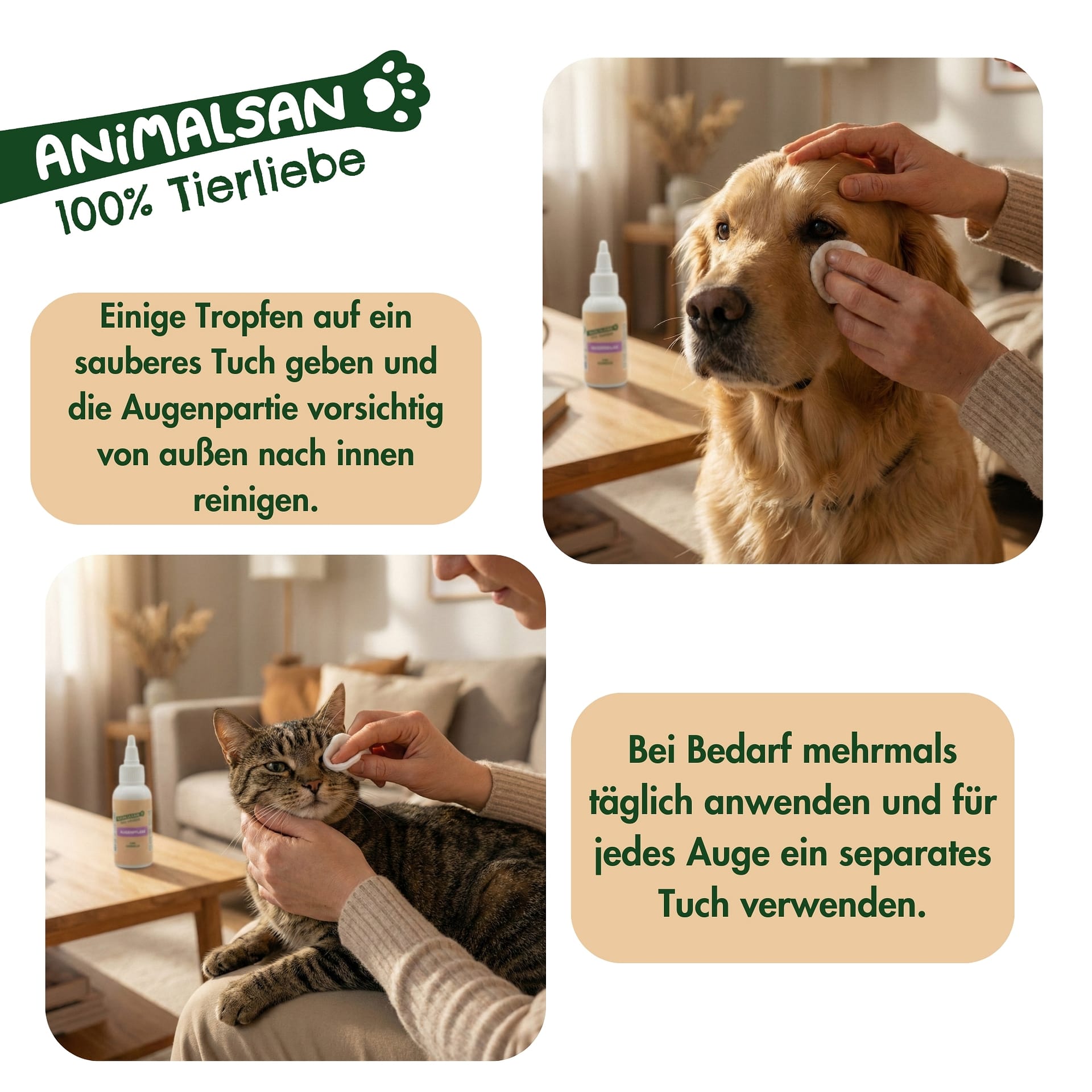 Die milde Lösung eignet sich für die äußere Augenreinigung und kann regelmäßig im Pflegealltag angewendet werden. Animalsan Augenklar lässt sich einfach mit einem weichen Tuch oder Wattepad anwenden und ist für verschiedene Tierarten geeignet.