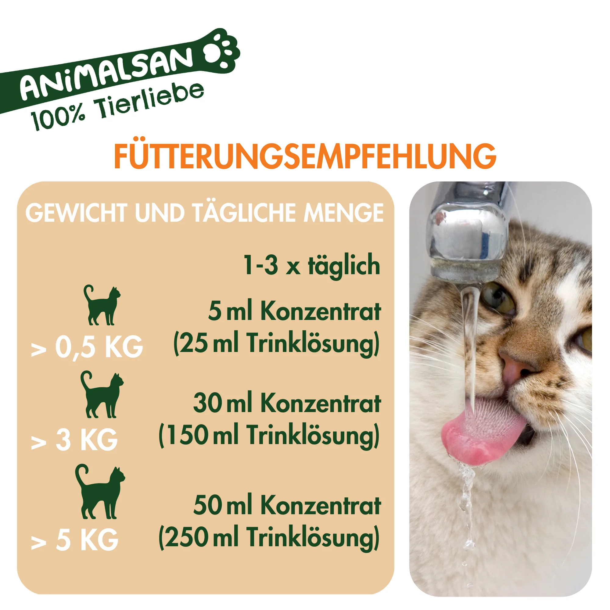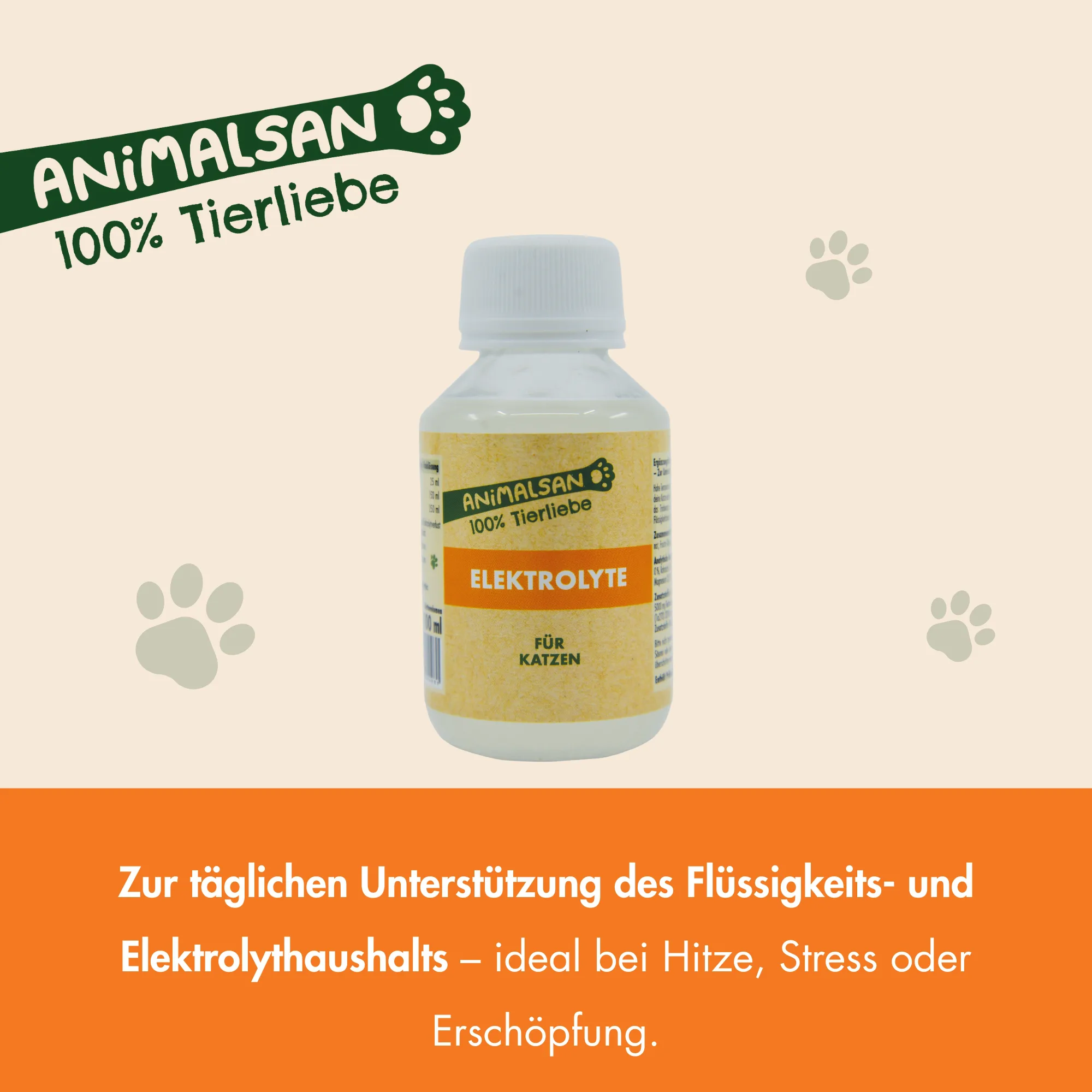 In besonderen Situationen kann der Flüssigkeitshaushalt deiner Katze aus dem Gleichgewicht geraten – etwa bei hohen Temperaturen, auf Reisen oder im Alter. Animalsan Elektrolyte Katze wurde entwickelt, um die tägliche Fütterung gezielt zu ergänzen, wenn ein erhöhter Bedarf an Flüssigkeit und Elektrolyten besteht. Das flüssige Konzentrat enthält eine ausgewogene Kombination aus Elektrolyten wie Natrium, Kalium, Magnesium und Calcium sowie Taurin und präbiotische Fructo-Oligosaccharide. Nach dem Verdünnen mit Wasser entsteht eine wohlschmeckende Trinklösung, die sich einfach in den Alltag integrieren lässt.