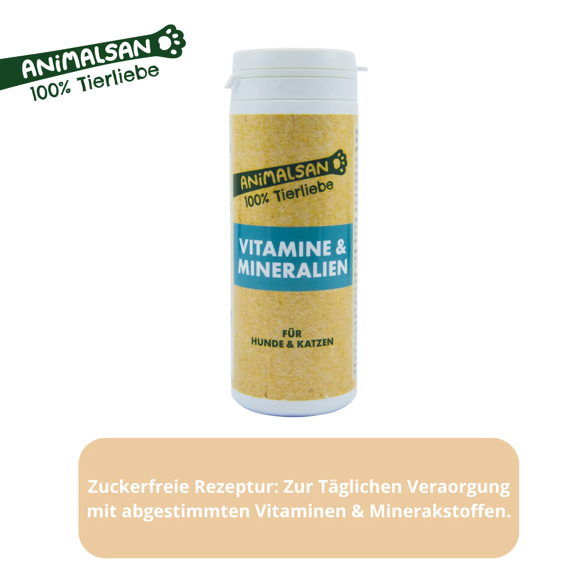 Eine ausgewogene Nährstoffversorgung ist ein wichtiger Bestandteil der täglichen Fürsorge. Animalsan Vitamine & Mineralien wurde entwickelt, um die Fütterung von Hunden und Katzen gezielt zu ergänzen – insbesondere in Lebensphasen mit erhöhtem Bedarf. Die zuckerfreie Rezeptur enthält eine sorgfältig abgestimmte Kombination aus Vitaminen, Mineralstoffen und Spurenelementen und eignet sich sowohl für junge Tiere im Wachstum als auch für ältere Tiere oder tragende Hündinnen und Katzen. Die Tabletten lassen sich einfach dosieren und problemlos mit dem Futter verabreichen.