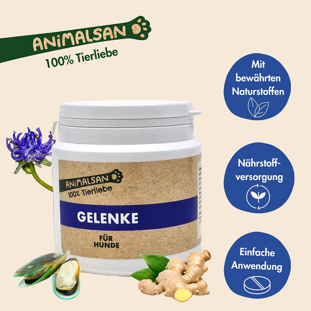 Dein Hund liebt es, zu rennen, zu toben und an deiner Seite aktiv zu sein. Mit zunehmendem Alter, durch Belastung oder rassetypische Besonderheiten kann das Bewegungsverhalten sich verändern. Animalsan Gelenke wurde entwickelt, um dich dabei zu unterstützen, deinem Vierbeiner auch langfristig seine natürliche Bewegungsfreude zu erhalten – auf sanfte und alltagstaugliche Weise. Die Kombination aus bewährten Inhaltsstoffen wie Grünlippmuschel, Teufelskralle, Ingwer und Weihrauch liefert wichtige Nährstoffe für Gelenke, Knorpel, Bänder und Sehnen.