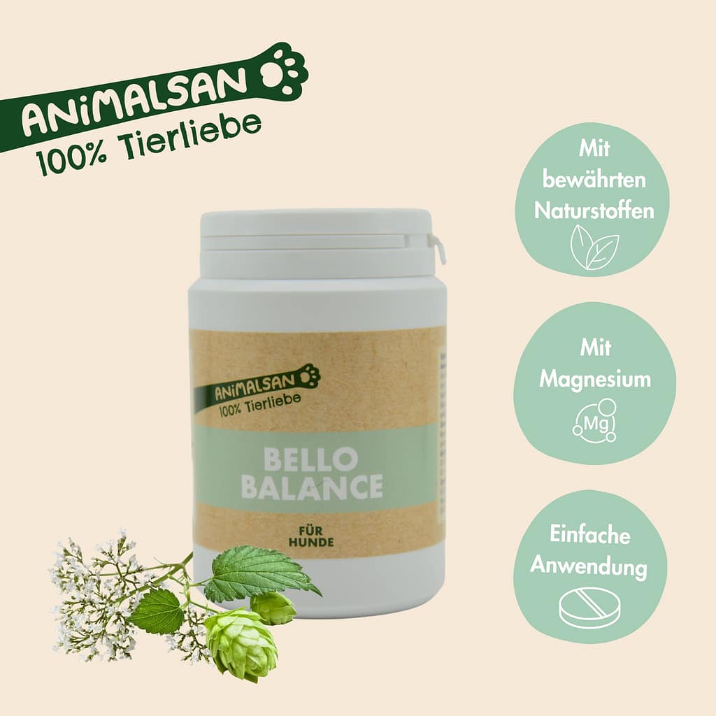 Ein neuer Ort, laute Geräusche oder einfach ein aufregender Tag: Manche Situationen verlangen deinem Hund ganz schön viel ab. Animalsan BelloBalance wurde entwickelt, um die tägliche Fütterung gezielt zu ergänzen – besonders in Phasen erhöhter Belastung. Die Tabletten enthalten L-Tryptophan, Magnesium sowie wertvolle B-Vitamine und ausgewählte Pflanzenstoffe wie Baldrian, Hopfen und Passionsblume. Sie lassen sich leicht verabreichen und bei Bedarf teilen.