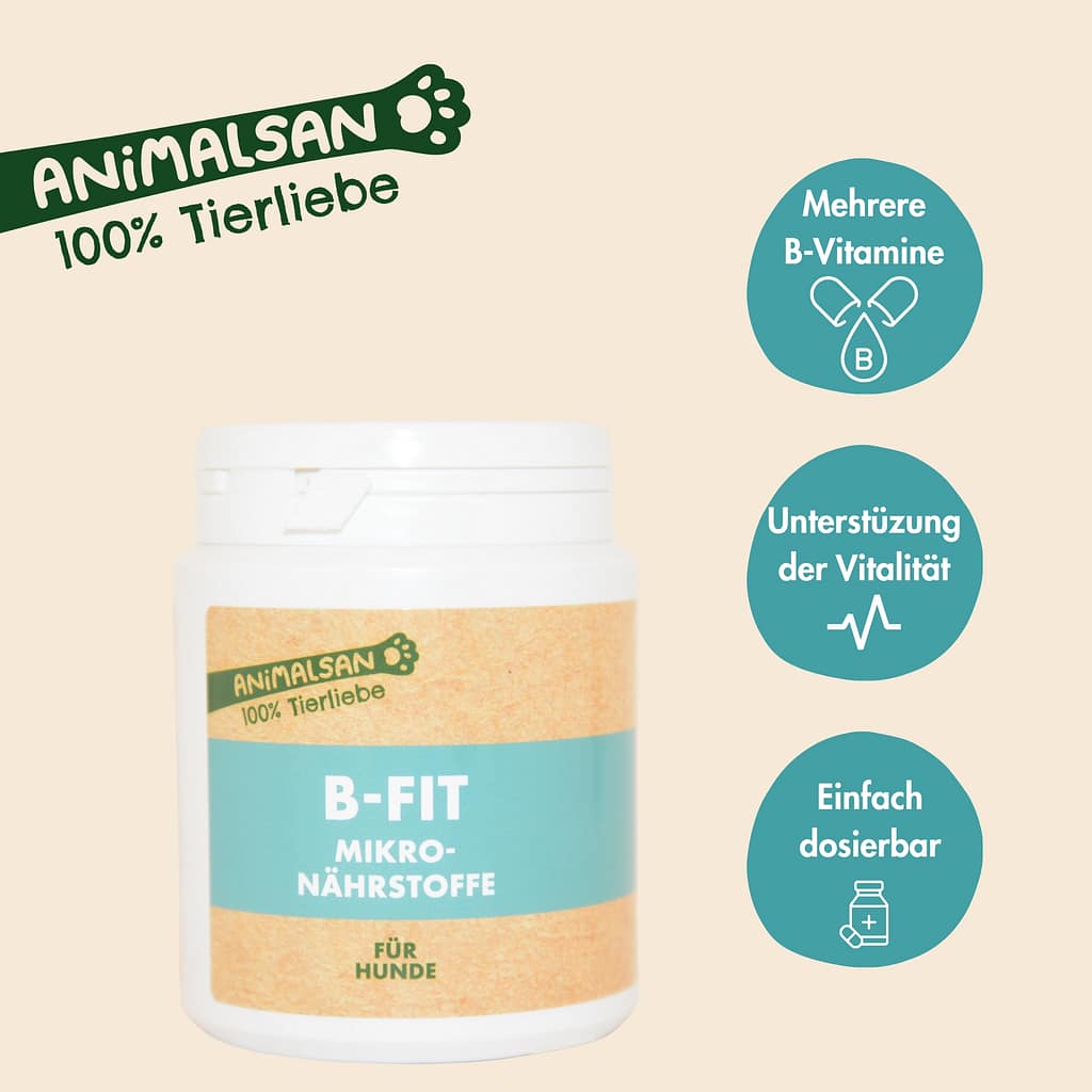 Manche Tage sind einfach voller Leben – und dein Hund braucht eine zuverlässige Versorgung mit wichtigen Nährstoffen. Animalsan B-Fit wurde entwickelt, um die tägliche Fütterung deines Hundes gezielt mit einem hochdosierten B-Komplex zu ergänzen. Die Tabletten enthalten Vitamin B1, B2, B5, B6, B12 und Folsäure in abgestimmter Rezeptur – ganz einfach als Leckerli oder übers Futter verabreicht.