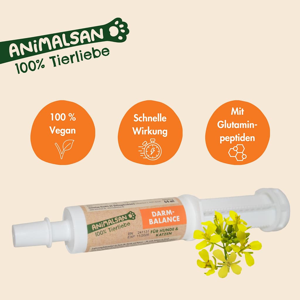 Animalsan Darmbalance wurde entwickelt, um die tägliche Fütterung gezielt zu ergänzen. Die 100% vegane Paste kombiniert zwei Probiotika (Enterococcus faecium, Lactobacillus acidophilus) mit zwei Präbiotika und hochwertigen Zutaten wie Pektin, Kaolin und Glutaminpeptid. Diese spezielle Zusammensetzung kann dazu beitragen, die normale Verdauung deines Lieblings zu begleiten. Die Paste wird direkt ins Maul gegeben oder einfach über das Futter gemischt und eignet sich für Hunde und Katzen jeder Größe.