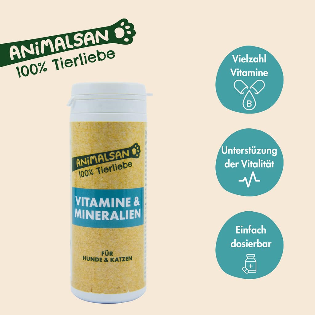 Eine ausgewogene Nährstoffversorgung ist ein wichtiger Bestandteil der täglichen Fürsorge. Animalsan Vitamine & Mineralien wurde entwickelt, um die Fütterung von Hunden und Katzen gezielt zu ergänzen – insbesondere in Lebensphasen mit erhöhtem Bedarf. Die zuckerfreie Rezeptur enthält eine sorgfältig abgestimmte Kombination aus Vitaminen, Mineralstoffen und Spurenelementen und eignet sich sowohl für junge Tiere im Wachstum als auch für ältere Tiere oder tragende Hündinnen und Katzen. Die Tabletten lassen sich einfach dosieren und problemlos mit dem Futter verabreichen.