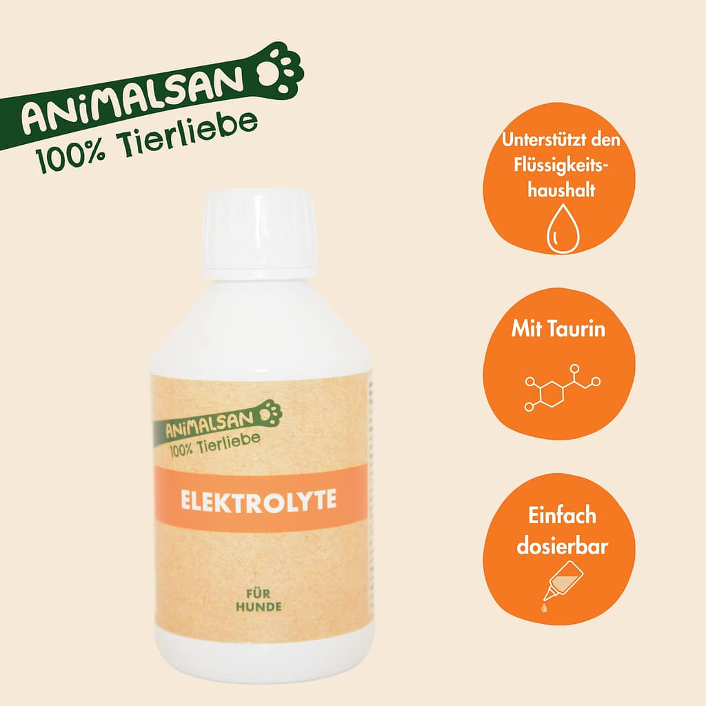 Ob nach großer Anstrengung, bei warmem Wetter oder einfach an Tagen, an denen dein Hund mehr leisten muss – manchmal braucht er etwas mehr Unterstützung. Animalsan Elektrolyte wurde entwickelt, um den Flüssigkeitshaushalt deines Hundes zu unterstützen. Das Konzentrat enthält wichtige Elektrolyte wie Natrium, Kalium und Magnesium sowie Taurin und präbiotische Fructo-Oligosaccharide aus Chicorée. Durch die einfache Verdünnung mit Wasser erhältst du eine wohlschmeckende Trinklösung – auch für Hunde mit höherem Bedarf.