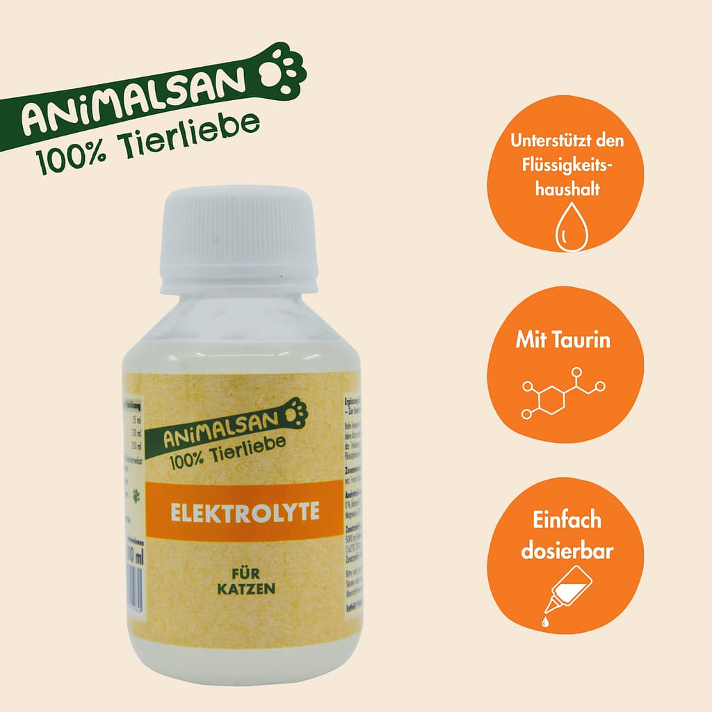 In besonderen Situationen kann der Flüssigkeitshaushalt deiner Katze aus dem Gleichgewicht geraten – etwa bei hohen Temperaturen, auf Reisen oder im Alter. Animalsan Elektrolyte Katze wurde entwickelt, um die tägliche Fütterung gezielt zu ergänzen, wenn ein erhöhter Bedarf an Flüssigkeit und Elektrolyten besteht. Das flüssige Konzentrat enthält eine ausgewogene Kombination aus Elektrolyten wie Natrium, Kalium, Magnesium und Calcium sowie Taurin und präbiotische Fructo-Oligosaccharide. Nach dem Verdünnen mit Wasser entsteht eine wohlschmeckende Trinklösung, die sich einfach in den Alltag integrieren lässt.